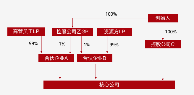 而C公司的设立,是为了进一步控制合伙企业A/B对核心公司的话语权。创始人可以根据需要,将合伙企业A/B的控股比例控制在可接受范围内。例如,如果企业A/B分别对核心公司占有20%的股权,企业C对核心公司占有60%股权,那么企业A/B无论何时都不能掌握公司的绝对决策权。