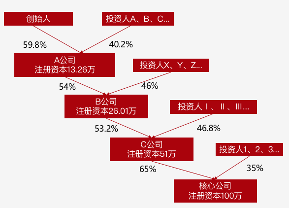 际连服务过的另一个创始人,他拥有很强大的融资网络,他的核心需求是借助投资、以最少的资金投入达到最大的控股权,由此际连为他推荐了以下的“金字塔架构”。