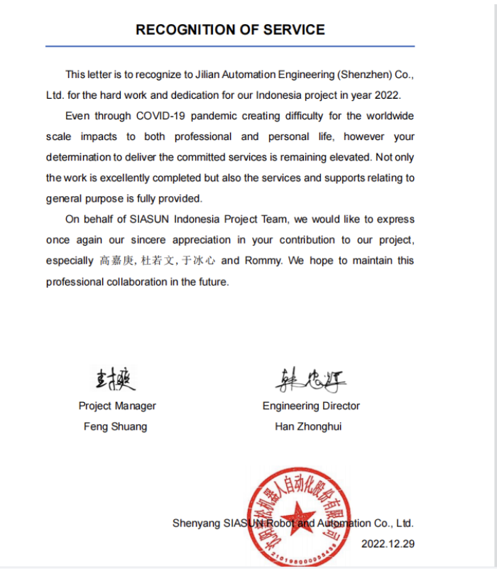 信中说:“感谢际连自动化工程(深圳)有限公司在2022年为我们印度尼西亚项目所做的努力和奉献。尽管新冠疫情给工作和个人生活带来了全球范围的影响,但你们提供承诺和服务的决心依然坚定,不仅出色完成了工作,而且全面提供了与工程所有相关的服务和支持。我们代表新松印尼项目组,在此对您对我们项目的贡献表示诚挚的感谢。希望我们未来继续保持专业合作。”